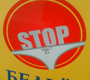 An advertisement stand of an underwear shop noticed by my friend Ivan in Vladimir, Russia, calls us to stop… but to stop what?.. 😊