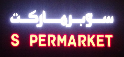 An Arabic s(u)permarket in Sharjah (unfortunately, I cannot read its name written with abjad) unluckily lost one of Latin letters in its neon signboard. 😊