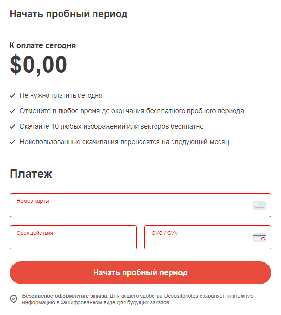 Конечно, не только украинская (❗️) компания DepositPhotos прославилась тем, что «для вашего удобства» даже при оформлении бесплатного пробного периода требует указать платёжные данные, которые «сохраняет… в зашифрованном виде для будущих заказов» 🤦, но подобный снимок экрана я вспомнил сделать именно у неё. Естественный после такого я передумал «начинать пробный период». 😠