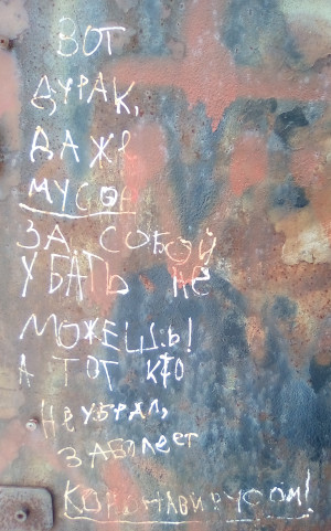 Не от антисанитарии заболеет, а в качестве кармического наказания. 😈 Именно в этом смысл корявой надписи на железном вагончике одного из диких пляжей Владимира.