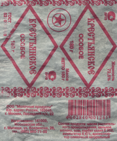 Я всю жизнь наивно полагал, что сливочное масло полагается делать из сливок, а их, в свою очередь, из коровьего молока… Но желание некоторых недобросовестных производителей удешевить производство с целью получения больших прибылей приводит к тому, что в составе сливочного масла (иронически названным «Крестьянским особым») вместо сливок оказывается «ароматизатор сливочный натуральный», разбавленный «маслами растительного происхождения», химикатами-канцерогенами E 202 и 417, а также… рыба сом!.. 😮 И при этом контора-производитель лицемерно называется «Молочные продукты»! 😁 А вот юридический адрес у неё точно «говорящий» – «Последний п/к» – «Послений путь» для тех, кто попробует их масло?.. 😉