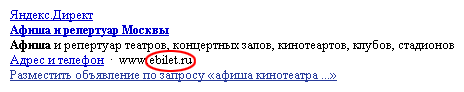 Совершенно случайно, искав в «Яндексе» расписание фильмов владимирского кинотеатра «Художественный» (своего сайта у него до сих пор почему-то нет), я получил на правой панели рекламных объявлений вот такой призыв посетить сайт с неблагозвучным зазванием E-bilet.ru… 😊