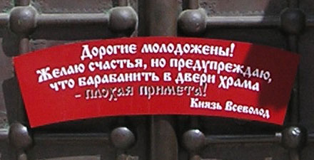 Говорят, эта предупреждающая надпись сохранилась на дверях Дмитриевского собора во Владимире со времён князя Всеволода «Большое гнездо», с времён которого и повелось, что свадебные кортежи останавливаются у храма и по какой-то там примете стучат в него… 😊
