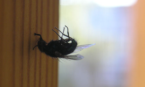 Сие чудо природы я обнаружил на собственном балконе – обыкновенная муха, видимо, с налёту, буквально воткнулась хоботком и передними лапками в деревянную раму, предположительно, по общеизвестной глупости пытаясь вылететь наружу сквозь стекло! 😊 Погибнув смертью храбрых, она так и осталась висеть перпендикулярно раме и параллельно полу, удерживаемая в таком положении каким-то чудом! 😊