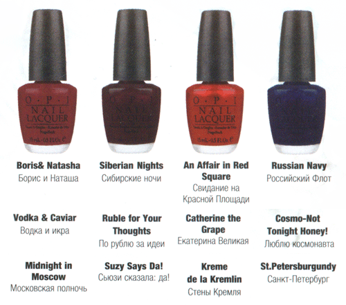 Один из крупнейших производителей лака для ногтей, американская компания “OPI” специально для России создала коллекцию лаков, которую так и назвала: «Русская коллекцмя» (Russian Collection). И это ж надо было дать им такие смешные названия, в очередной раз подтверждающие стереотипичность восприятия нас американцами! 😂