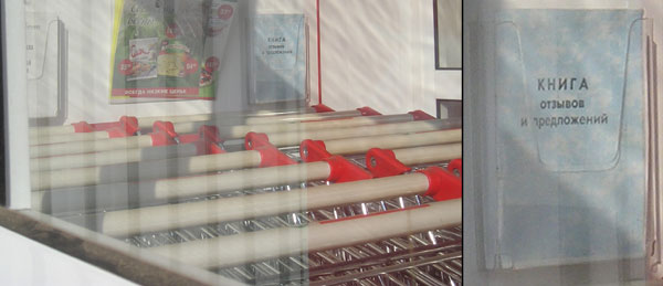 Один из владимирских универсамов известной сети я посещаю чаще других, причём иногда на велосипеде, и мне почти всегда удаётся найти для него место среди множества тележек. А вот покупателям, желающим внести свои отзывы и предложения в соответствующую книгу, будет не так просто это сделать!.. 😛