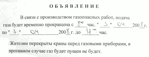 Если первая часть данного объявления с двери подъезда моего коллеги Павла понимается однозначно, то вторая часть заставляет задуматься, будет газ пущен, или всё же не будет?.. 😊