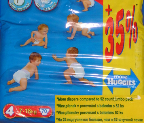 Сию странную арифметику на упаковке одноразовых подгузников заметила моя супруга: по мнению производителя, если к 52 шт. в обычной упаковке прибавить 24 шт. (они же 35%, хотя 35% от 52 – это 18 шт.), то получится не 76, а 70 шт.! 😂