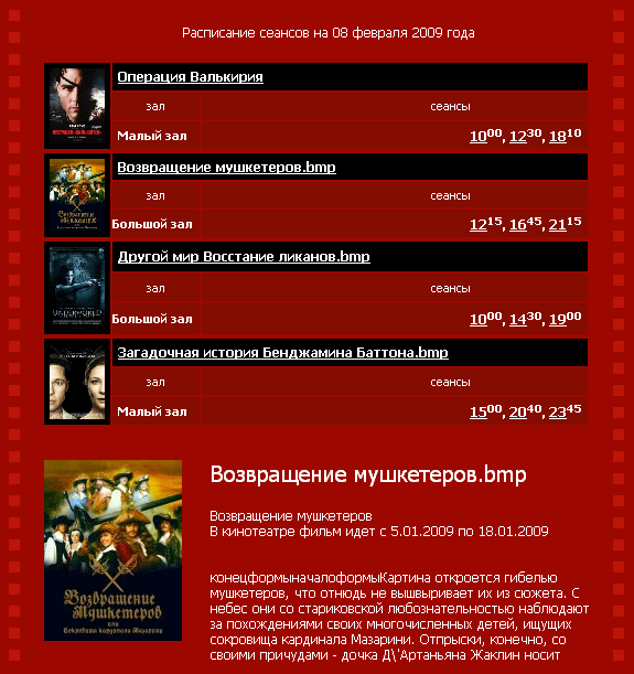 На сайте одного из владимирских кинотеатров явно не стесняются того, что тырят информацию о фильмах с других сайтов (прежде всего это видно по слову «конецформыначалоформы», сохраняющемуся при неумелом копировании HTML-содержимого через буфер обмена), более того, умудряются публиковать крайне неаккуратно (расширение “.bmp” в названии фильма, «д\'Артаньян» с обратной косой чертой). 🤦