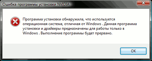 Павел: программе установки драйвера видеокарты Nvidia не понравилась моя операционная система Windows Vista – по её мнению, это не Windows 😊; при этом её не смутил тот факт, что ни в какой другой операционной системе я не смог бы её запустить, так как программа установки является исполняемым файлом формата Win32 Portable Executable. 😛