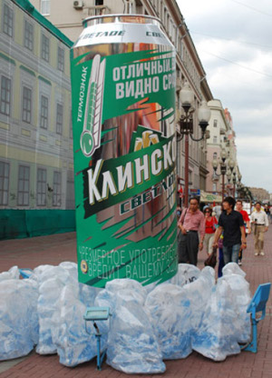 Лиа: Москва, Старый Арбат, можно сказать, туристический центр столицы, посреди которого стоит вот такой муляж банки пива в окружении неприглядного вида мешков, только издалека напоминающих лед… 😮 И что же домой везут туристы на память? Штампованые сувениры и крайне популярную фотографию около нового «памятника» пиву?.. 🙁