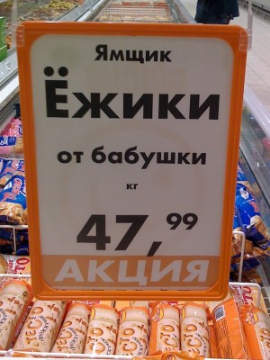 Павел: снято в гипермаркете «Глобус» во Владимире; мало того, что некая «бабушка» ловит «ёжиков» и выставляет их на продажу, так ещё и распространителем у неё выступает какой-то «ямщик» 🤔 – вообще не ценник, а шифровка. 😊