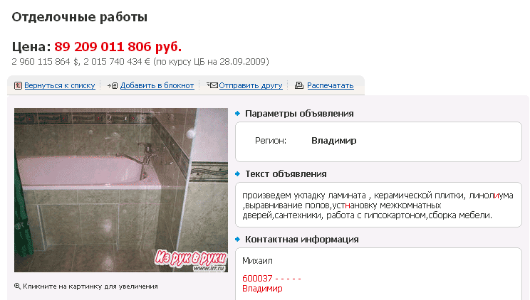 Похоже, владимирские отделочники решили по своим ценам не отставать от владимирских же строителей. 🤑 Однако, видимо, природная скромность не позволила Михаилу при такой цене указать свои контактные данные. 😎
