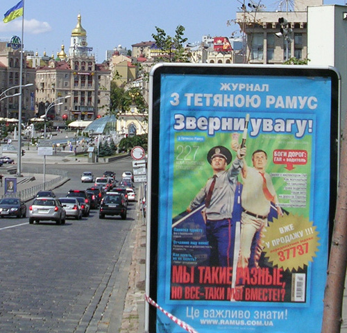 Лиа: «боги дорог», гаишник и водитель – в чувстве юмора киевским рекламщикам не откажешь; только вот что-то не очень чётко видно, что у водителя в руках, права или всё же… 😊