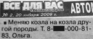 Оксана: может, кому-то это объявление в провинциальной газете (Александровского р-на Владимирской обл.) и покажется забавным, но для его автора это наверняка насущная проблема. 😊