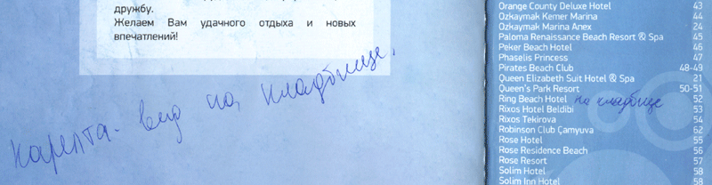 Рекламные альбомы известной туристической компании Pegas Touristik как всегда безупречны, и только честные турагенты города Владимира оставляют в них жизненные (точнее, «смертные») комментарии своей рукой! 😁