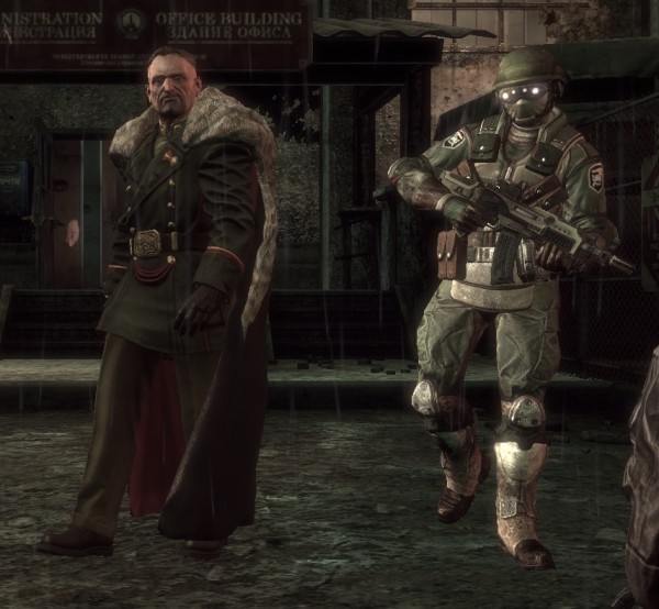 Павел: «антисоветская» игра «Сингулярность» (Singularity), секретный научный центр «Каторга-12»: русский генерал в кожаном плаще, отороченном мехом. 😊 Интересно, кто его надоумил носить медаль на лацкане? Справа – представитель современного русского “spetznaza”. 😊 ПНВ, коллиматорный прицел и прочие навороты – в комплекте.