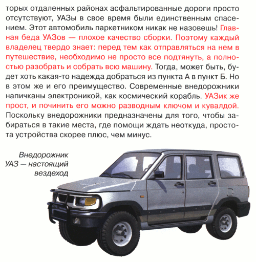 Вот такой отношение к нашему автопрому прививают нашим детям в книжке-энциклопедии «Легковые автомобили» московского издательства «Росмэн» – как говорится, настоящий русский мужик («росмэн») УАЗика не боится!.. 😂