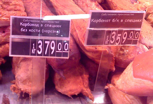 Павел: обратите внимание на два соседних ценника. По данным «Википедии», «карбонад» – это «кусок свинины из филейной части, как правило жареный или запечённый», а вот «карбонаты» – это «соли и эфиры угольной кислоты», например, карбонат кальция, насколько я помню из школьного курса химии, – это обычный мел. 😊 Вот как можно было поставить ошибочную табличку, если рядом стоит правильная? 🤦