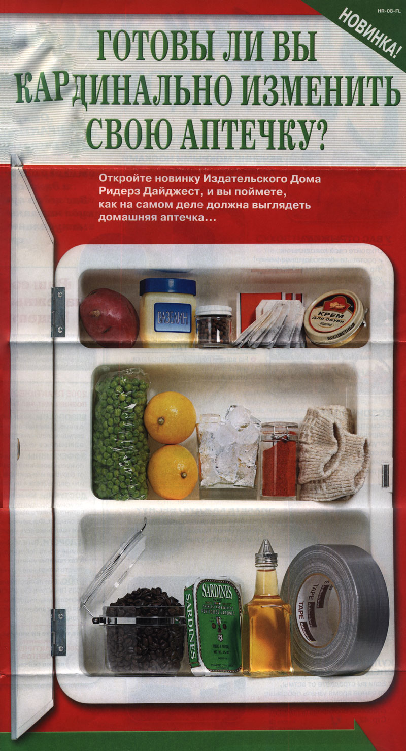 Вот, что по мнению издательского дома Reader's Digest должно входить в состав настоящей домашней аптечки: картофелина, вазелин, какие-то орешки, чай, крем для обуви, зелёный горошек, лимоны, сушёная морковь, перчатки, кофейные зёрна, сардины, растительное масло и скотч! 😂