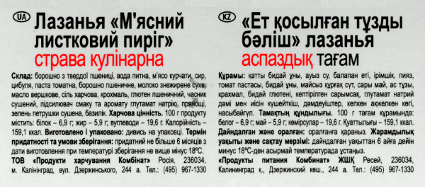Производитель (на самом деле вкусной) лазаньи быстрого приготовления на упаковке по-русски предупреждать не решился, а вот по-украински и казахски – пожалуйста, знайте, что это, и что с вами станет после съедения! 😊