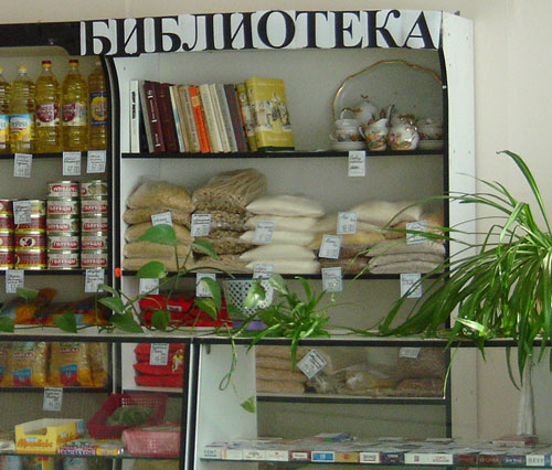 Мои друзья Игорь и Елена в одном из магазинчиков сельского типа в нашем городе Владимире наткнулись вот на такую странную разновидность библиотеки – съедобной, так сказать! 😉
