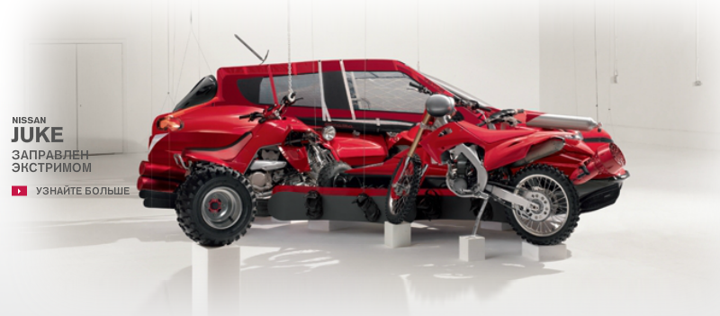 Я, конечно, могу предположить, что дизайнеры официального сайта Nissan в России очень хотели показать, что «внутри» Nissan Juke есть экстремальные спортивные мотоциклы, но в результате, если не вглядываться, получилось так, как будто никаких мотоциклов нет, а есть попавший в ДТП кроссовер. 😮