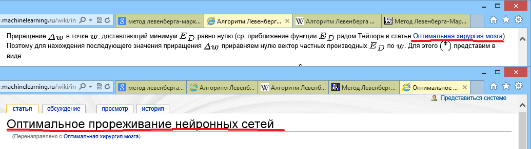 Павел: сижу как-то, разбираюсь с методами решения задачи нелинейной оптимизации, читаю в википедии MachineLearning.ru статью по алгоритму Левенберга-Марквардта и натыкаюсь на ссылку на статью «Оптимальная хирургия мозга». 😊 Думаю, что за…? и ради интереса щёлкаю по ссылке и попадаю на страницу «Оптимальное прореживание нейронных сетей». 😁 Похоже, автор первой статьи творчески переосмыслил название второй. 😊