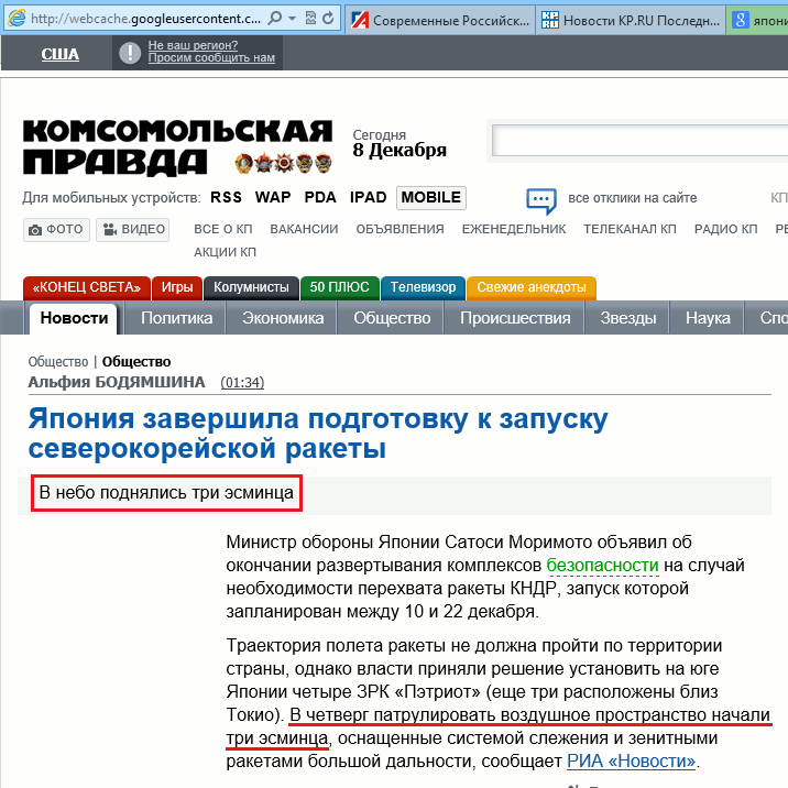 Павел к вопросу о компетентности журналистов: оригинал заметки журналисты «Комсомольской правды», похоже, уже стёрли, но в кэше Google она ещё осталась (на всякий случай приложил ещё снимок, вдруг из кэша тоже сотрут) – эсминцы у них, понимаешь, вылетели на патрулирование воздушного пространства… 😮 Фантастики они там, что ли, перечитали? 😊 (Прим. ред.: это некая Альфия Бодямшина умудрилась так «творчески переработать» технически корректную статью-первоисточник РИА «Новости».)