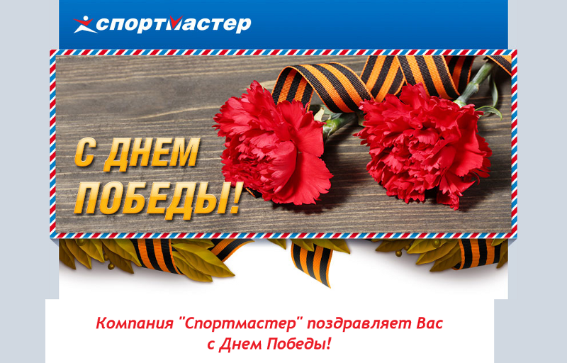 Павел: вот такое «жизнеутверждающее» поздравление с двумя (чётное число!) гвоздиками прислал мне магазин «Спортмастер» на 9 мая. 😮 Очень надеюсь, что у них в рассылке нет ветеранов, а то намёк получится совсем уж неприличным… 🙁