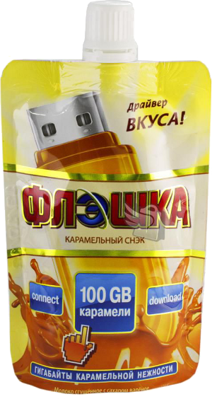 Николай: случайно встретил в магазине варёную сгущёнку в пакетике «Флэшка на 100 ГБ карамели» 😊 – видимо, предназначена для поедания за Интернетом; надо будет посканить и съесть, или наоборот. 😊