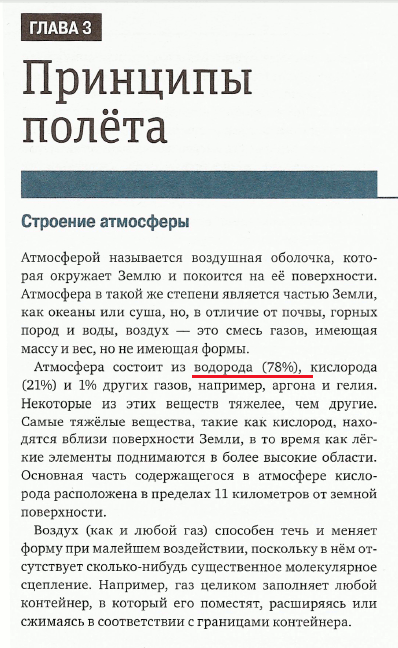 Павел: в процессе расширения кругозора попалась мне электронная версия книги «Энциклопедия пилота» издательства «Осоавиахим» – переводной вариант официального англоязычного издания “The Pilot’s Handbook of Aeronautical Knowldge”, изданного Федеральным управлением гражданской авиации США. Мелких «косяков», конечно, в переводе немало: то предкрылок закрылком обзовут, то ещё чего в этом духе. Но вот это (см. подчёркнутый текст) – просто супер! При таком составе атмосферы (водород + кислород), достаточно кому-нибудь в любой точке земли закурить или развести костёр, да что там – хватит просто удара молнии (уж где-нибудь на Земле всегда идёт гроза) и… с планетой и всем её населением можно будет попрощаться! 😁 Решил проверить, может, в английском варианте ляп, – нет, всё нормально: “The atmosphere is composed of 78% nitrogen, 21% oxygen, and 1% other gases, such as argon or helium”. В общем, полагаю, переводчик попался нового поколения, из тех, что сдавал ЕГЭ и удачно угадал ответы тестов. 😊 Ладно, положим, английское “nitrogen” он забыл, в словарь заглянуть поленился, но уж не знать состав собственной атмосферы… 😮