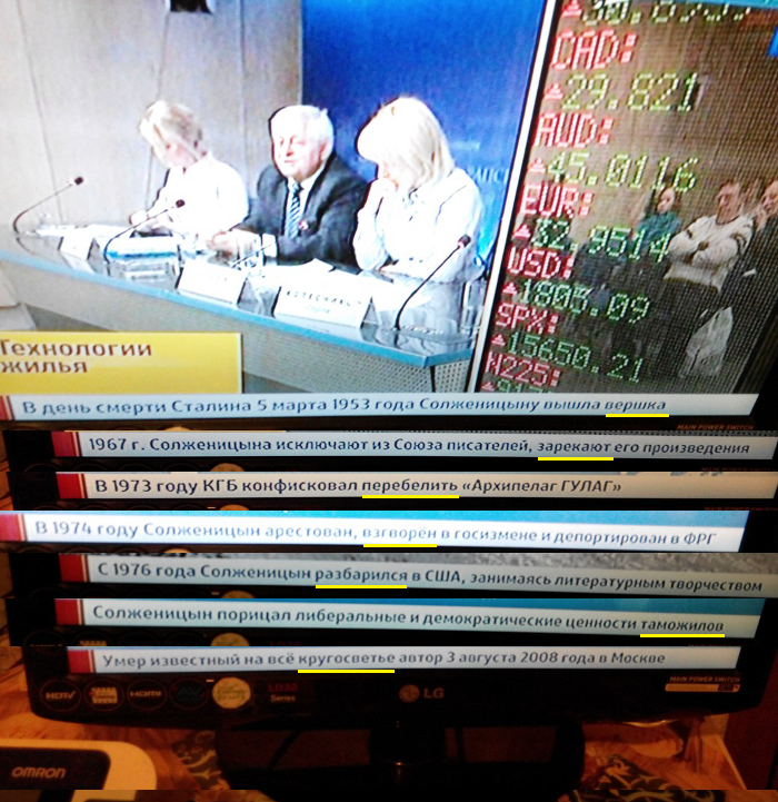 Павел: в бегущей строке «России-24» сегодня шла биография Солженицына; к сожалению, заснял я её не всю, но выглядело это довольно странно, в частности, я не понял, что такое «взговорен», «разбарился», «таможилы», «вершка», «конфисковал перебелить» 😮 и т. д. – даже на опечатки не похоже, такое впечатление, что вообще не по-русски; но все остальные слова – русские; в общем, что это было, я так и не понял, прикалывался, что ли, кто специально?