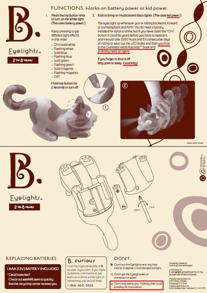 Лиа: инструкция к игрушке с призывом быть собой после предупреждения о том, что нельзя с ней делать, и с предположением о том, что у ребёнка появится свой агент, если ему придётся поменять батарейки. 😊