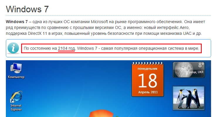 В украинском Донецке 2011 года считают, что Windows 7 будет самой популярной операционной системой и в 2104 году. 😊