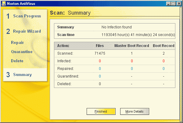 Великого и могучего Norton AntiVirus'а можно одурачить очень просто: мне для этого понадобилось запустить полное сканирование системы, а в процессе его выполнения перевести системные часы на сутки назад. После этого он думает, что проработал миллион часов. 😁