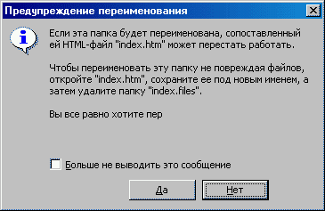 Когда я вздумал переименовать папку index.files, связанную с файлом index.htm (в результате «сохранения полностью» HTML-страницы из обозревателя Internet Explorer), операционная система решила запросить у меня подтверждение, что я действительно хочу пер… 🤔