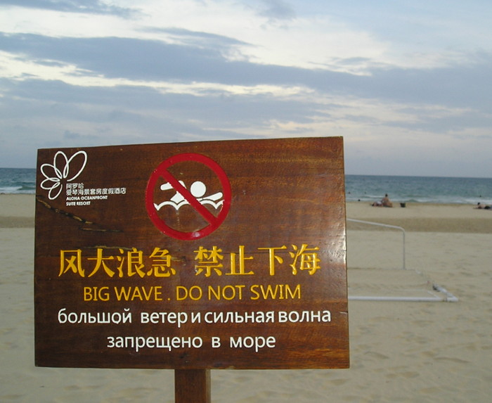 Это англоязычным туристам запрещено купаться в Южно-Китайском море (“do not swim”) 😛, а для русских всё наоборот – большой ветер и сильная волна запрещены, так что можно спокойно купаться (даже когда футбольные ворота на заднем плане упали от ветра). 😁