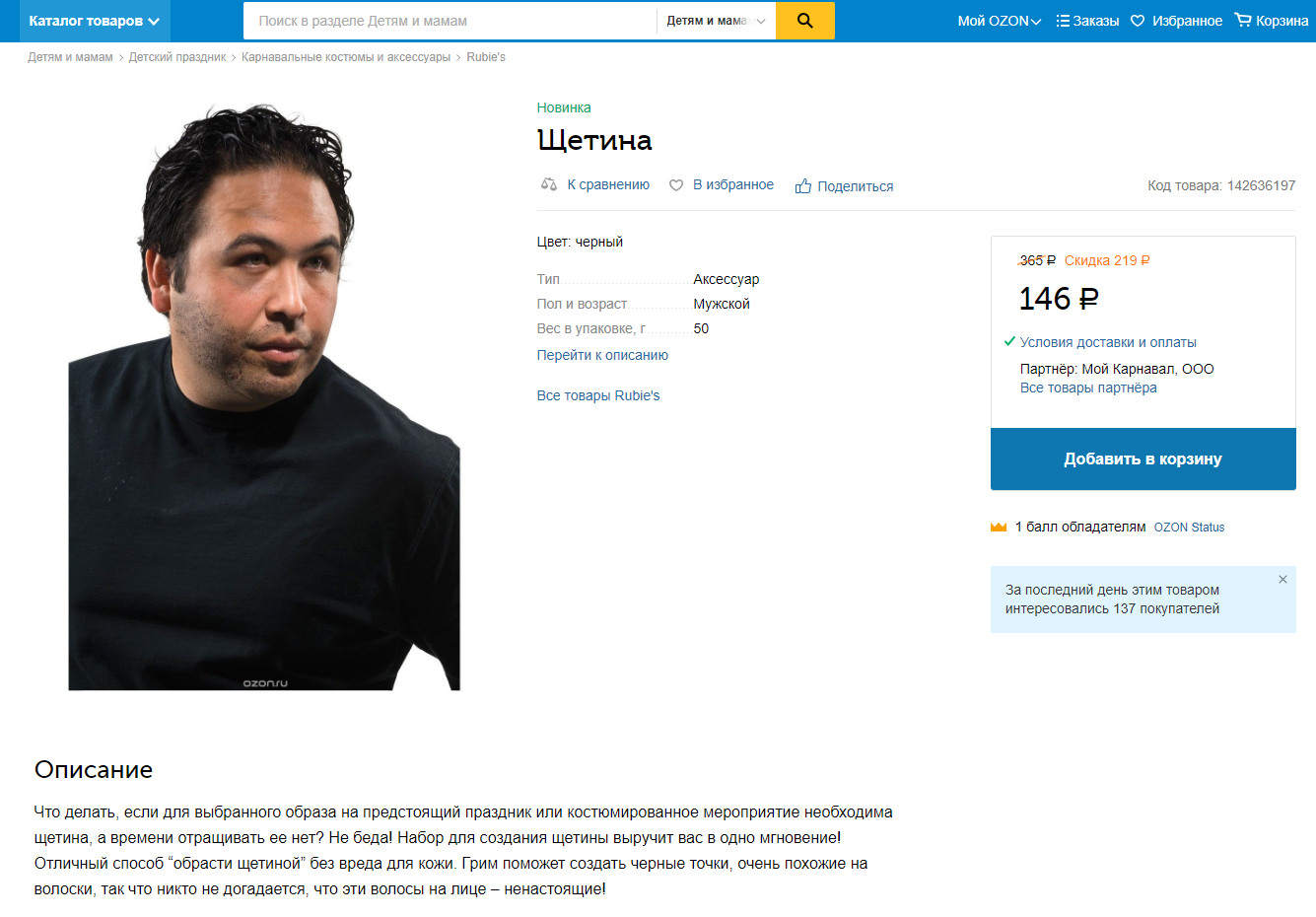 Юлия: удивительно не только существование этого товара в природе 😮, но и то, что в Интернет-магазине Ozon.ru он отнесёна к разделу «Детям и мамам [которым некогда отращивать щетину] → Детский праздник → Карнавальные костюмы и аксессуары». 😂