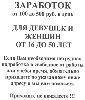 Мой коллега Илья заприметил в нашем городе Владимире вот такое вот двусмысленное объявление… Нет, это конечно, понятно, что призывы заняться распространением всяких там «Гербалайфов», «Орифлэймов» и т. п. давно уже стали привычными, однако ж формулировки некоторых из них почему-то напоминают чуть ли не вербовку представительниц древнейшей профессии…