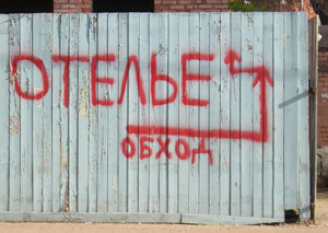 На «живописном» заборе одной из строек в нашем городе есть такая вот надпись, указывающая не то на «грамотейское» ателье, не то на предположительно фешенебельный 😊 отель «Е». 😁