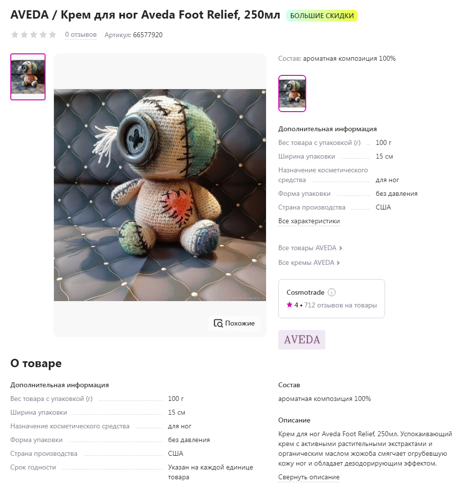 Ирина: ИП Бондаренко Анна Сергеевна aka CosmoTrade на Wildberries такой картинкой указывает то ли на результат использования крема американской торговой марки Aveda, то ли на целевую аудиторию. 😁